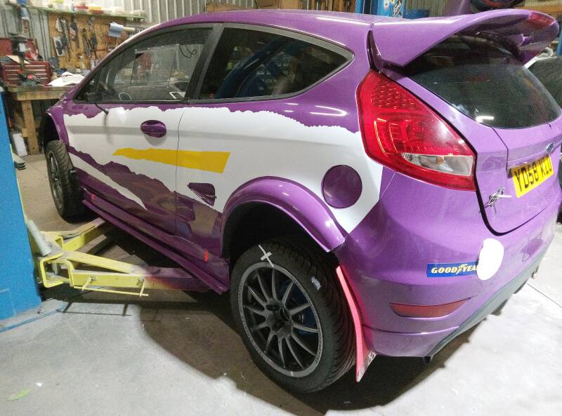 There will be stronger springs put on the back, Malc spoke to somebody that said he would send some but we haven't seen them yet. Russ sprayed the whole thing purple and Malc had some vinyl graphics made to finish the look, they were incredibly difficult to fix properly but we got there in the end, although they went on a bit different to the original plan. There are still quite a few stickers and things to be affixed but there is no hurry. I understand the plan is to get it to it's MoT soon and then do the rest as and when. I can't imagine things will stay standard in the engine department, a rolling road tune is definitely on the cards but it should be quite nippy as it is with half it's original weight to drag about.