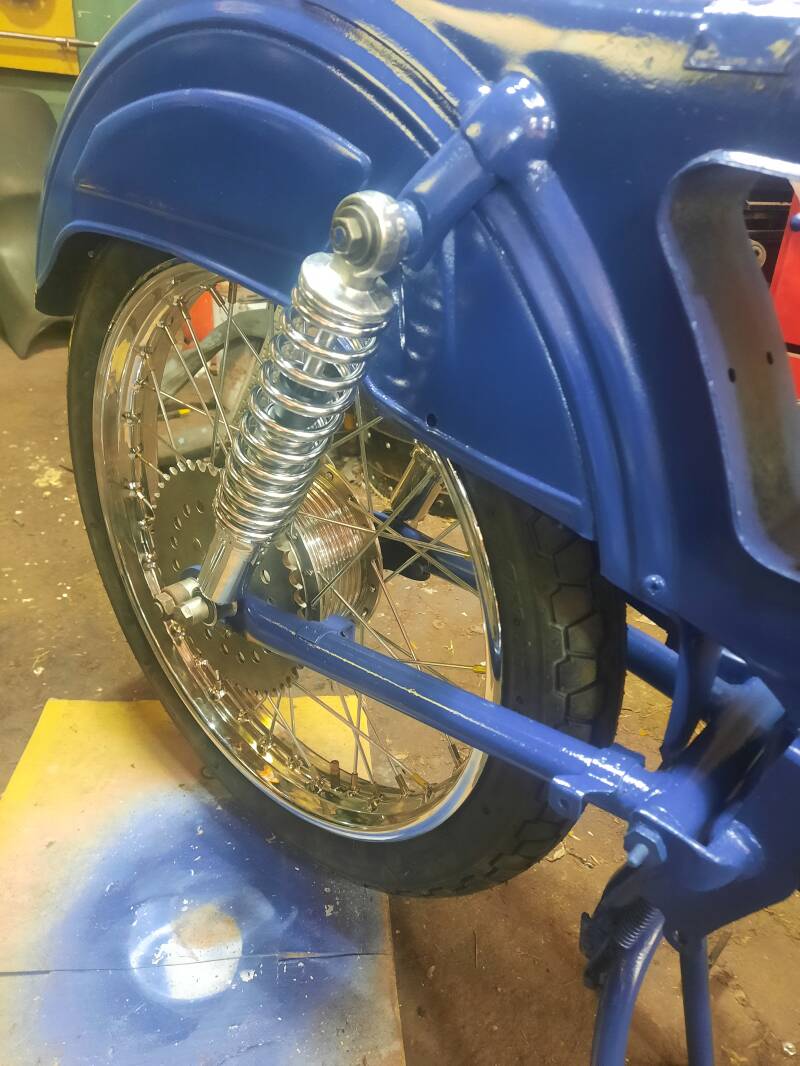The front wheel was a bit of a faf to fit as the brake drum retaining pin has to go through a slot in the bottom of he tight hand fork. It went in in the end and the nuts are now done up and it's all looking rather splendid. While I was at it I connected up the rear brake and tested it, that's all good.
