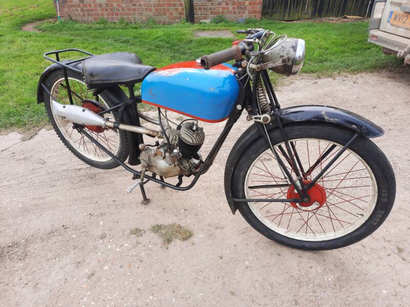 It's quite a strange little bike with some rather peculiar features like the kickstart that can be operated from either side of the bike, when running the kickstart becomes the foot rests. It's also highly unusual for a 100cc bike to have twin exhausts, the ones on this bike have no real silencing capability so it is unusually loud. It is fitted with a headlamp but it has no electrical system to power it. That wasn't unusual at the time, it was fairly common to have battery powered lights or small dynamos like the ones commonly fitted to bicycles. This headlamp is clearly not the right one as it has an aperture for a speedo and no speedo drive. I have a battery one that would be more period correct that I may put on.