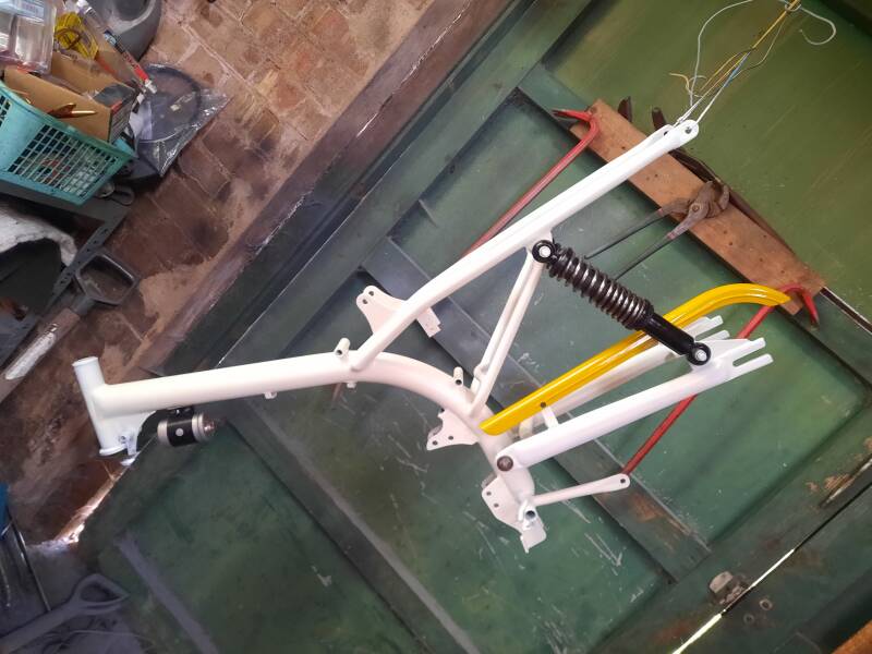 I restored the shocks, they are in good working order and just needed cleaning, polishing and respraying, they need new rubber bushes, which are on order. The chain guard was the first bit to get some yellow, I panicked when it first went on but as it dried it darkened to the sort of colour I was looking for. Once dried I put it back on the frame and could see the contrast between the black, white and yellow parts, I think it's going to look splendid.