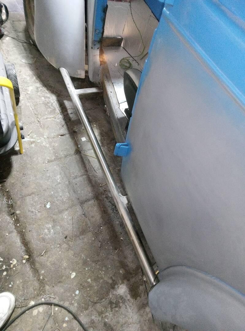 Having procured the stainless steel tube at last week's visit to Normous Newark autojumble, I had no excuses left, it was time to get on with the running boards, or side skirts, if you prefer. I had no way of making an appropriate curve in a piece of metal that big so using the tube worked around that problem. I cut two recesses in each piece which accepted square steel tube, which I could then cut to length and weld to the existing chassis rails. I figured two each side would be plenty strong enough, This proved to be the case when I tested them by jumping up and down on each one. I reckon that's how Aston Martin do it although they probably use a proper fat bloke rather than a cut price old bloke that's only fat around the middle.